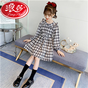 浪莎韓版女童花邊翻領黑白格子連衣裙2021春裝新款兒童長袖公主裙