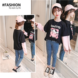 女童春夏2021新款洋氣潮流假兩件白色長袖T恤休閑時髦兒童上衣女